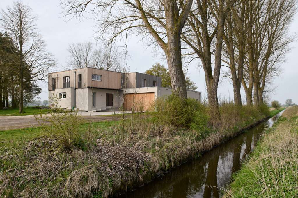 Manche unserer Häuser dürfen in ganz besonders schöner Umgebung entstehen. Dieses Donaubauer-Holzhaus liegt in direkter Nähe zu einem landwirtschaftlichen Betrieb, eingebettet in die Natur und umgeben von alten Bäumen. Selbst ein kleiner Wassergraben begleitet das Haus – Naturerlebnis inklusive.