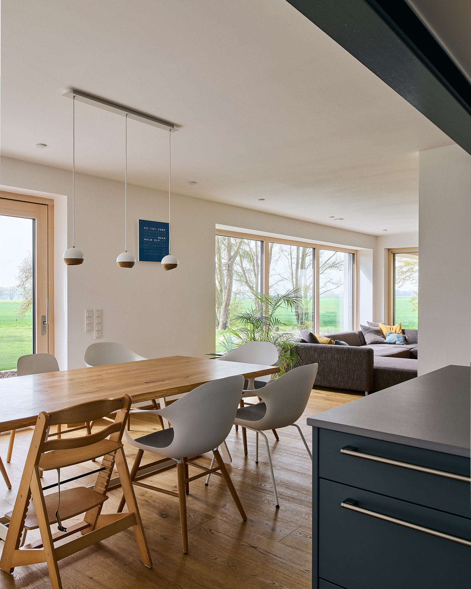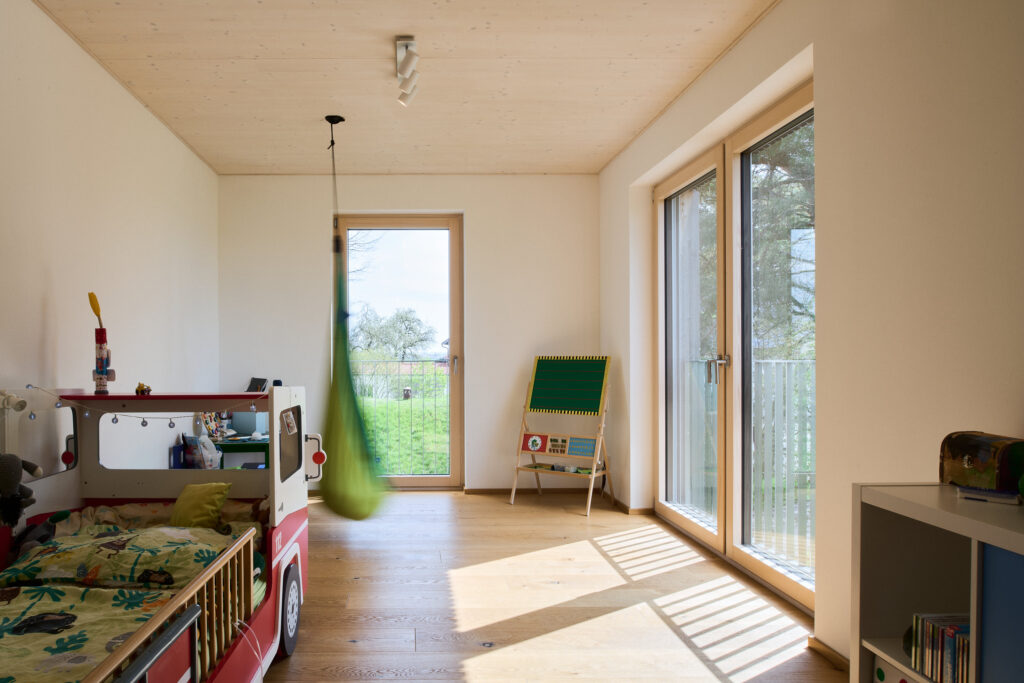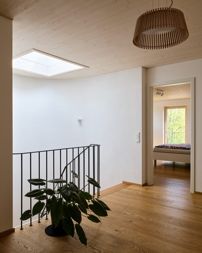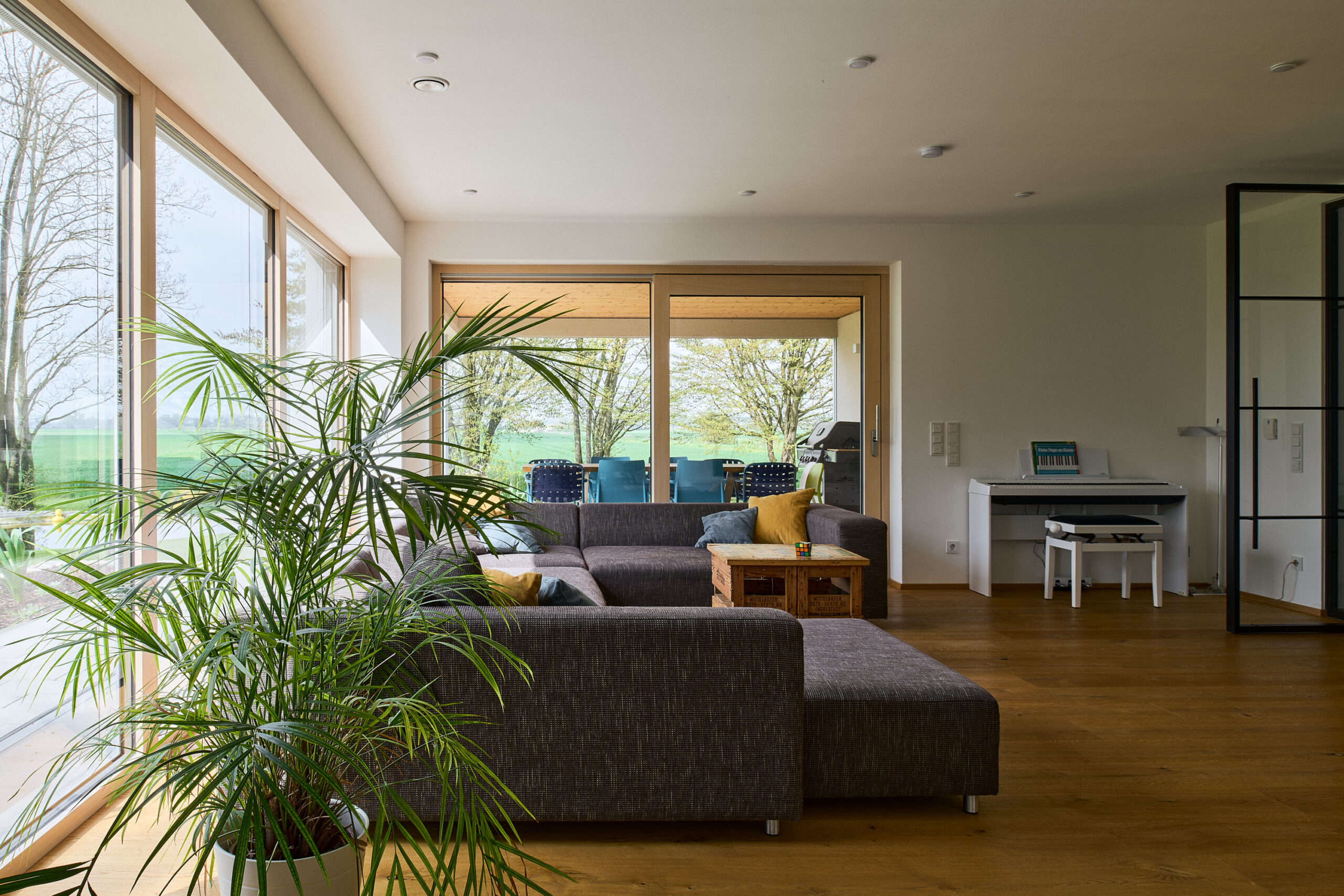 Die Brettsperrholz-Massivholzdecke ist statisch tragendes Bauteil und zugleich prägendes Gestaltungselement. Großzügige, dreifachverglaste Holz-Alu-Fenster sorgen für beste Energiewerte und freie Blicke ins Grün. Der Eiche-Parkettboden im Obergeschoss greift das nachhaltige Materialkonzept konsequent auf und schafft eine warme, behagliche Atmosphäre in den privaten Wohnräumen.