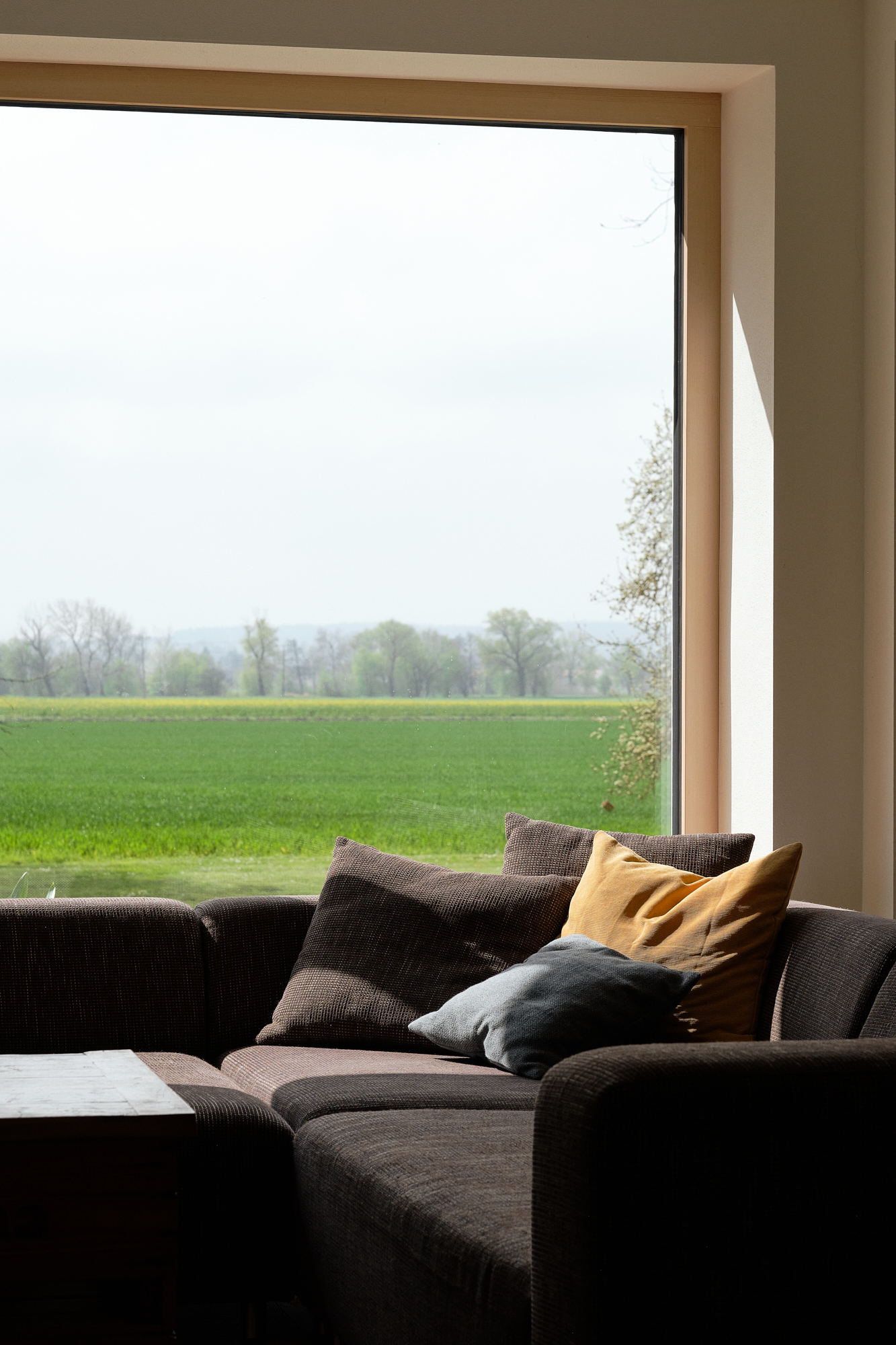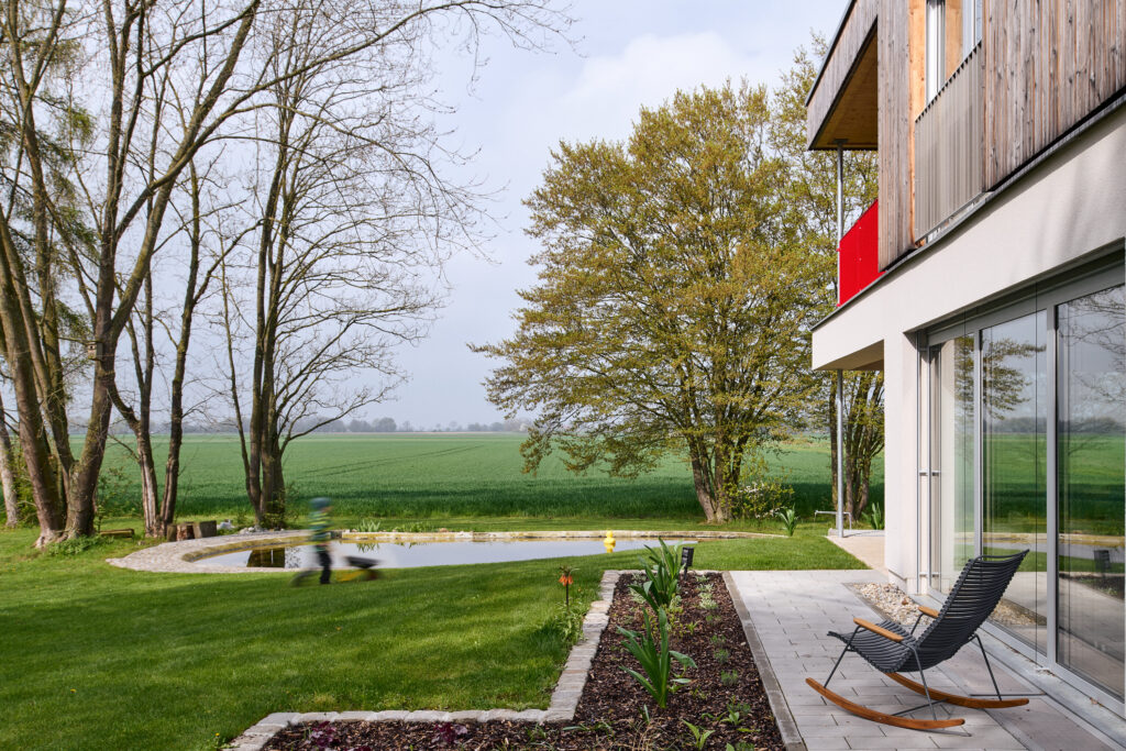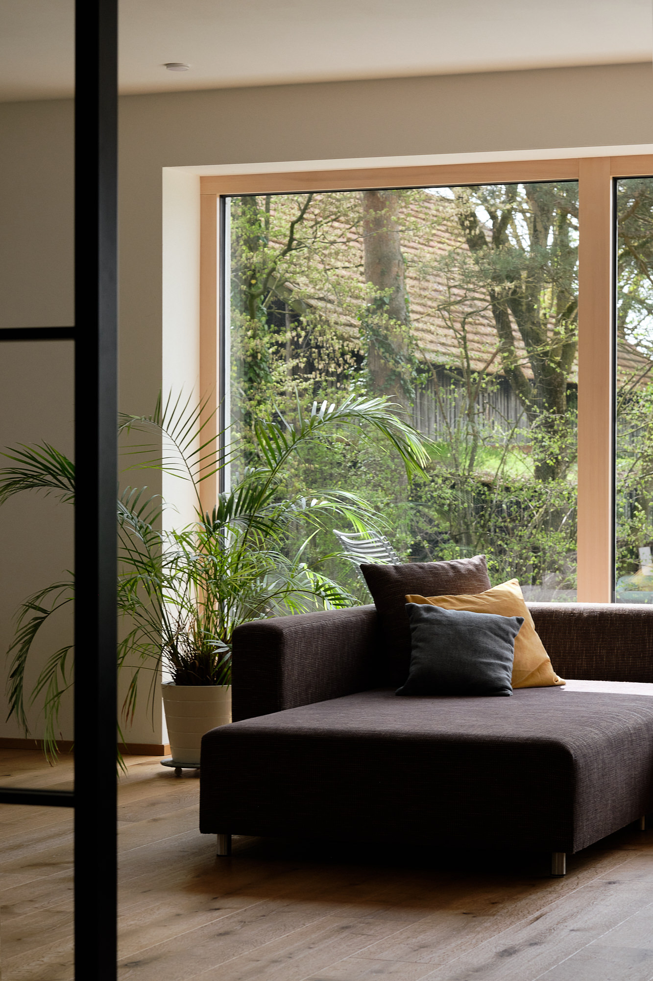Die Brettsperrholz-Massivholzdecke ist statisch tragendes Bauteil und zugleich prägendes Gestaltungselement. Großzügige, dreifachverglaste Holz-Alu-Fenster sorgen für beste Energiewerte und freie Blicke ins Grün. Der Eiche-Parkettboden im Obergeschoss greift das nachhaltige Materialkonzept konsequent auf und schafft eine warme, behagliche Atmosphäre in den privaten Wohnräumen.