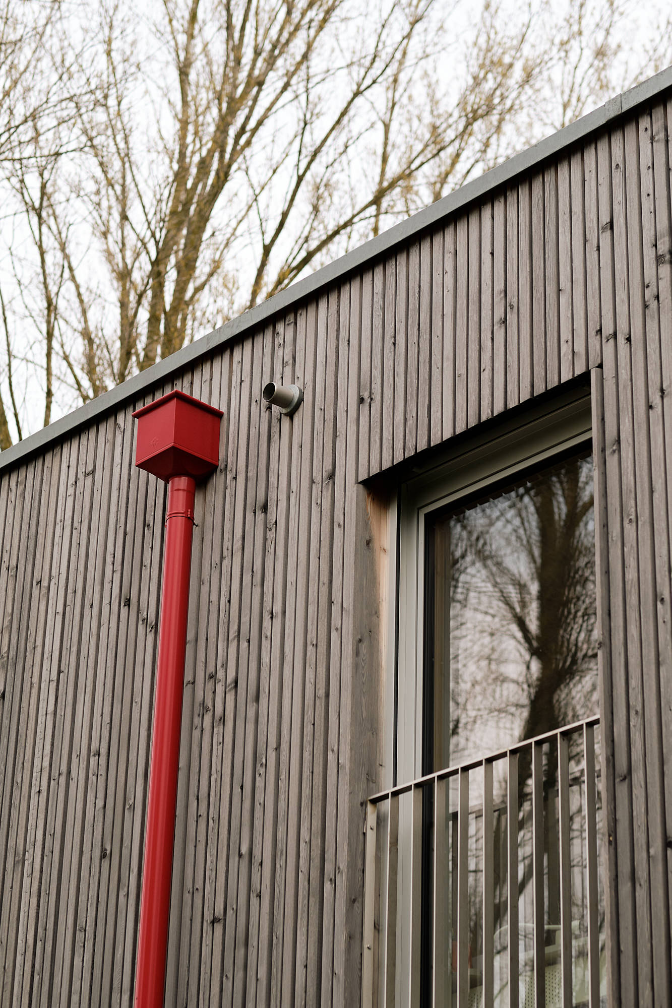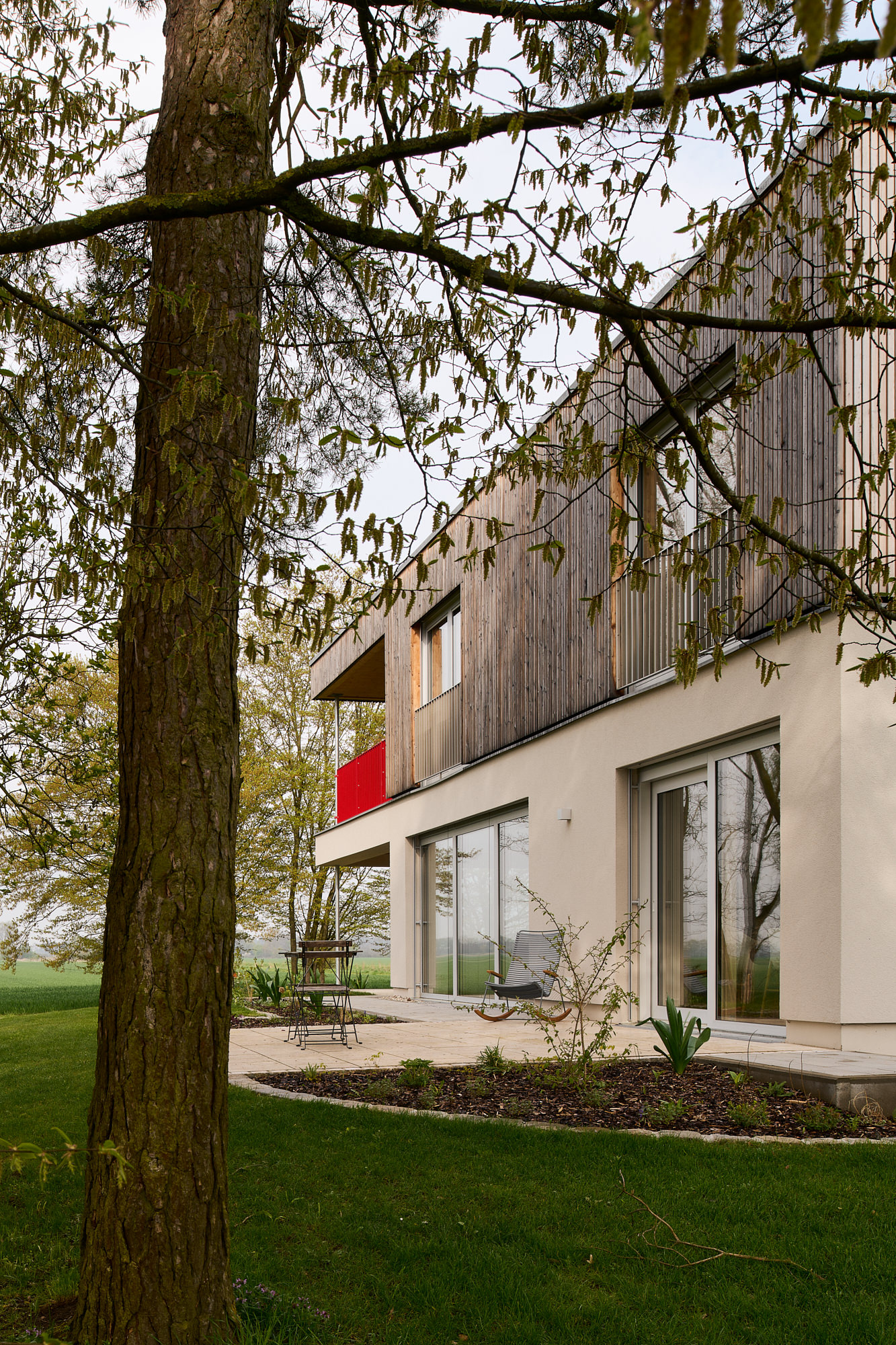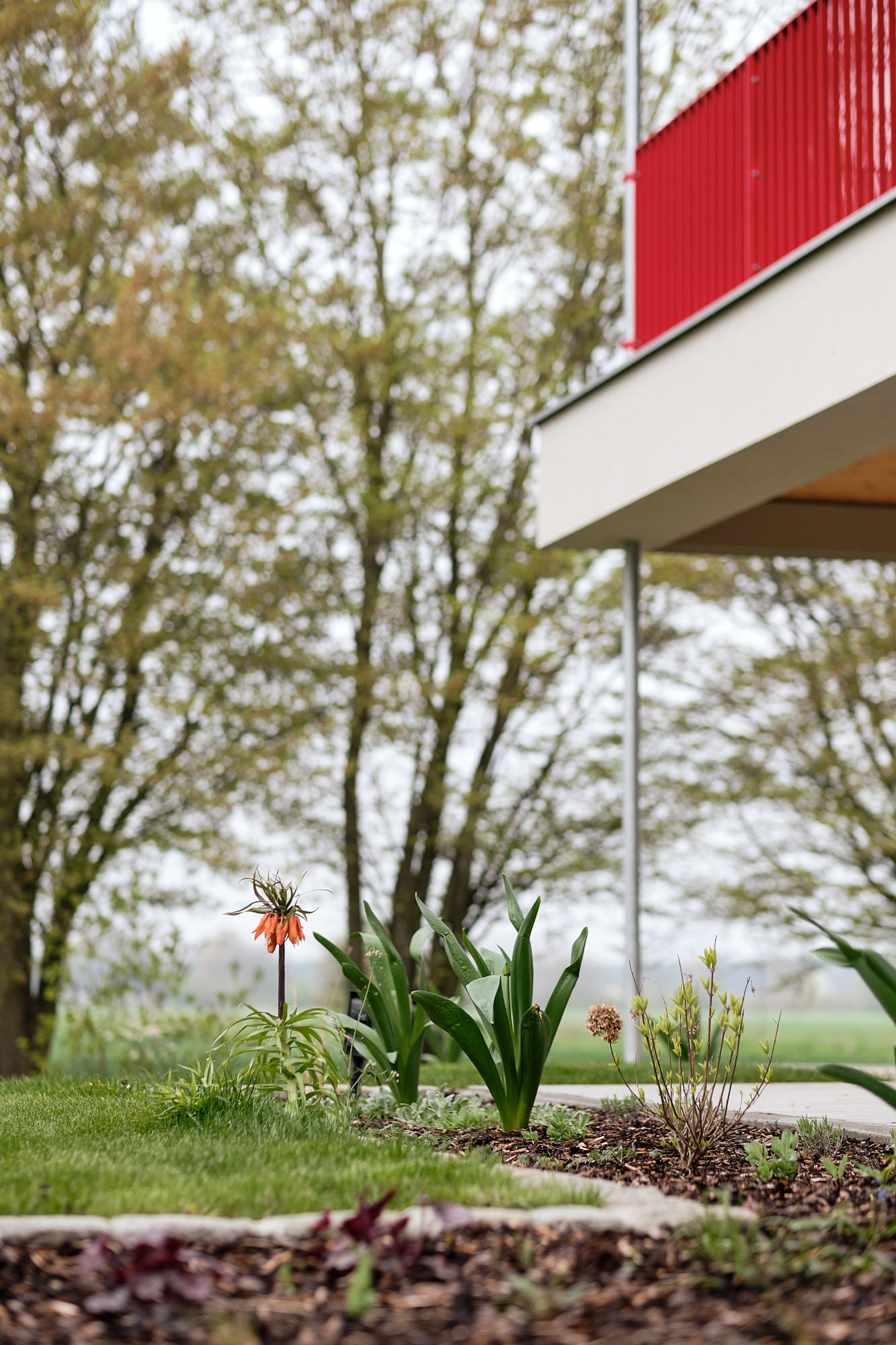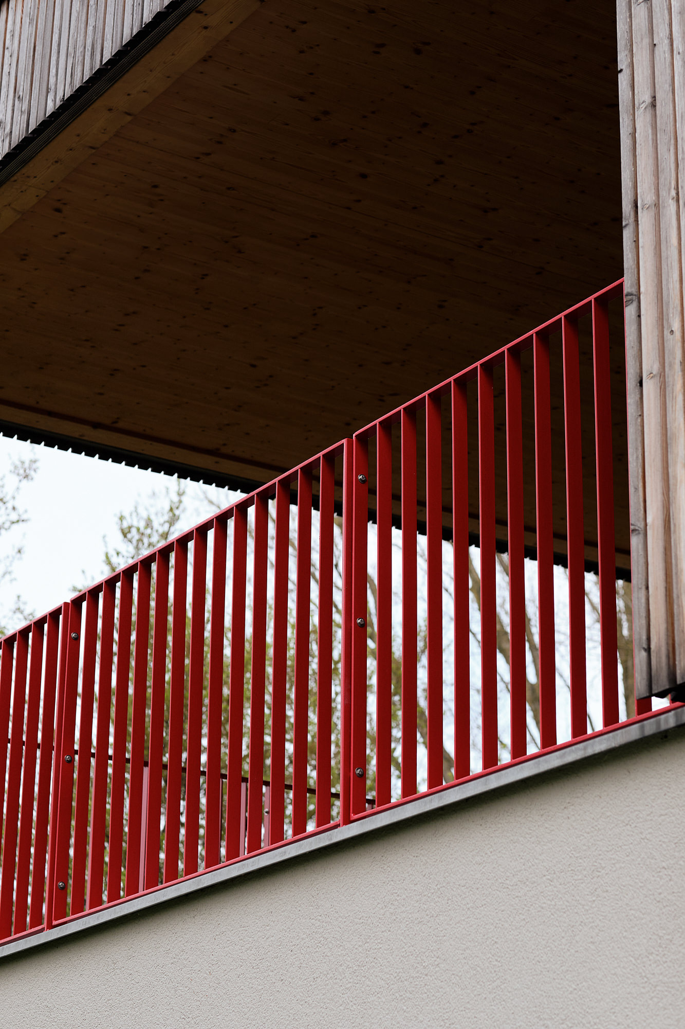 Ein besonderer Blickfang sind die roten Farbakzente am Balkongeländer und am Regenfallrohr – kleine Details mit großer Wirkung.