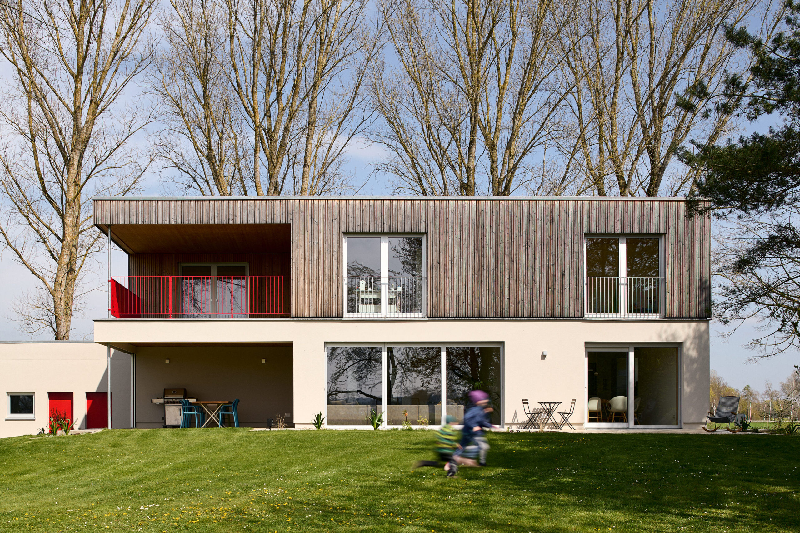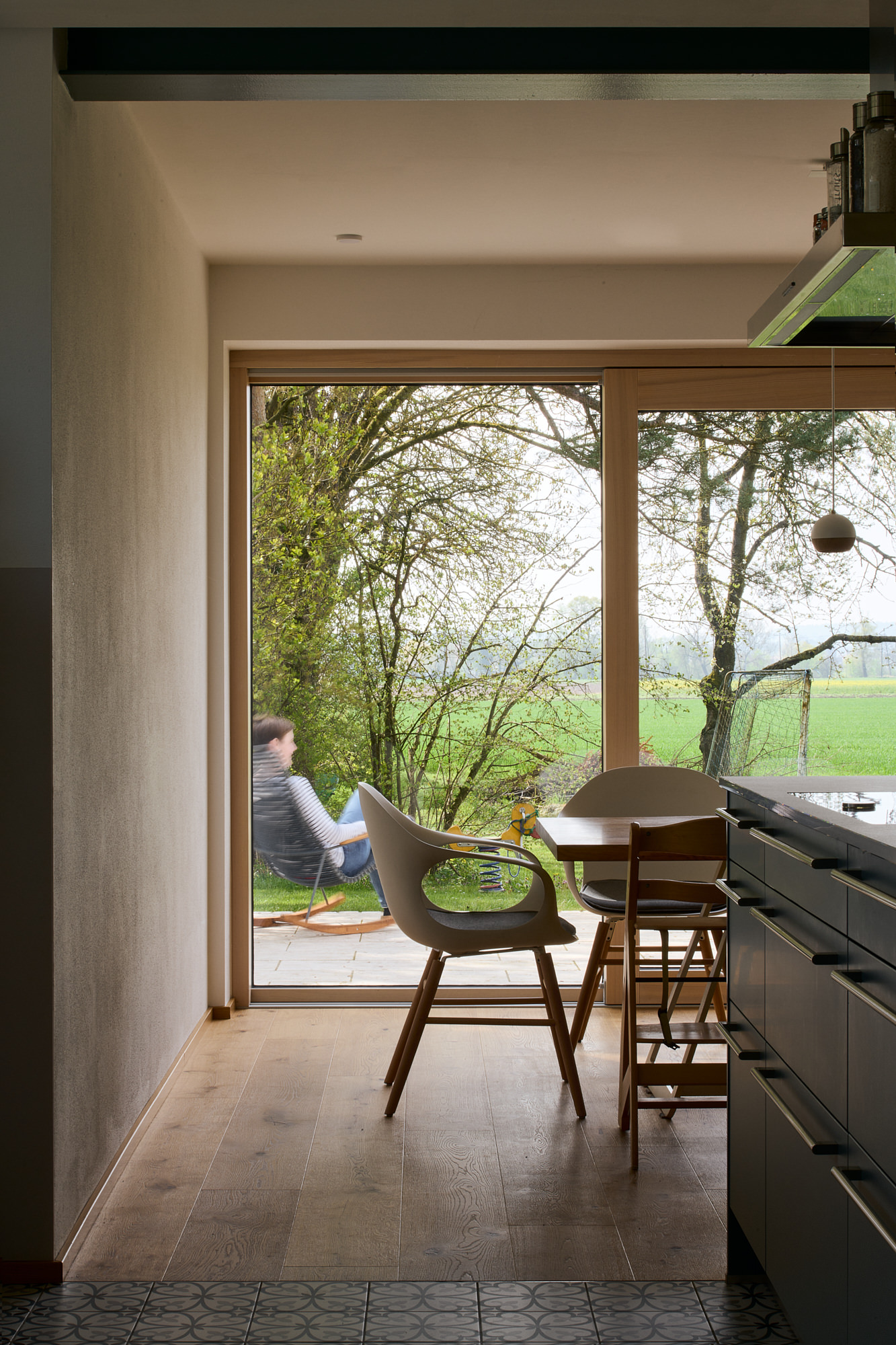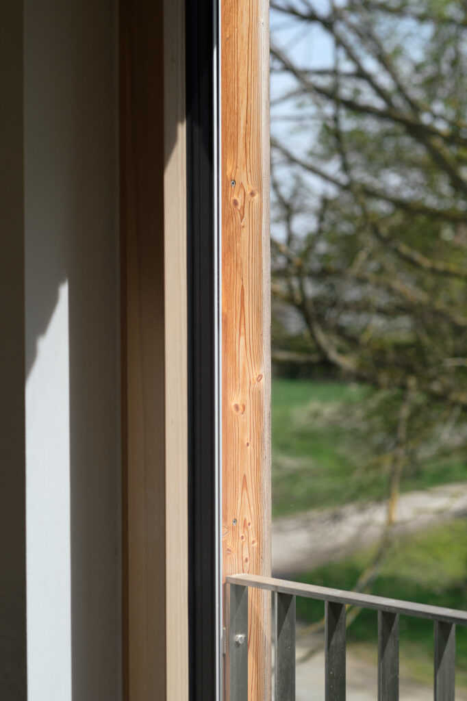 Auch das Erdgeschoss wurde im Zuge der Baumaßnahmen umfassend modernisiert. An die Bestandsfassade montierte vorgefertigte Holzbauelemente bilden heute eine neue, hochgedämmte Gebäudehülle. Das Ergebnis: ein energetisch zukunftsfähiges Wohnhaus mit ausgezeichneten Kennwerten.