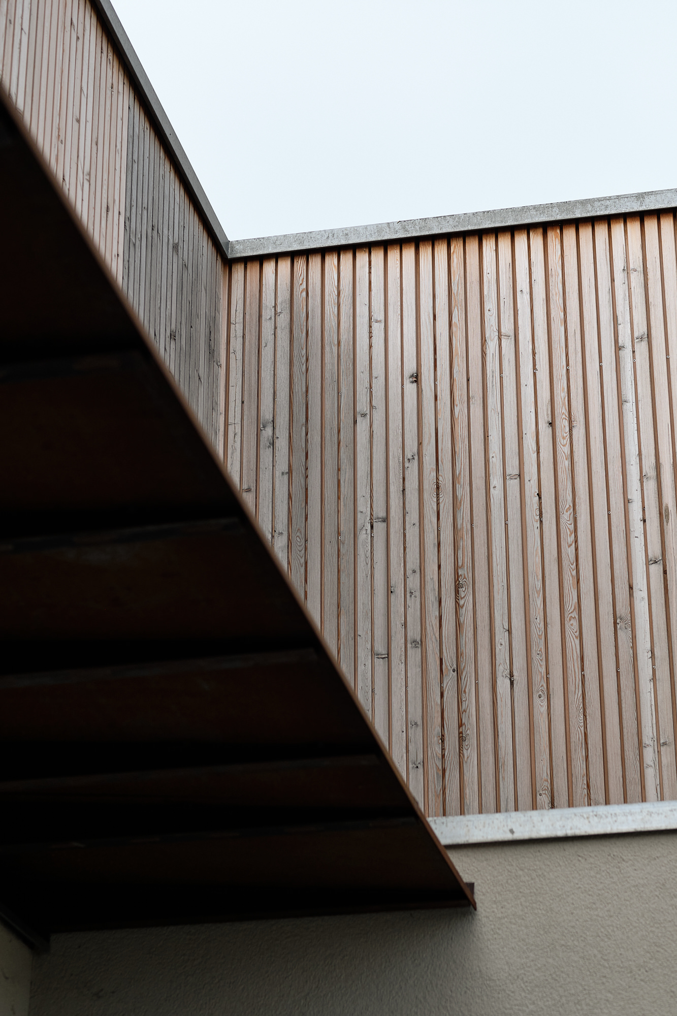 Gestalterisch setzt die Aufstockung ein bewusstes Zeichen: Die senkrechte Holzfassade aus sibirischer Lärche hebt sich klar von den sanierten Erdgeschosswänden ab, die mit Glattfilzputz versehen und in einem erdigen Braunton gehalten sind. Die Profilbretter sind übrigens 44 mm stark und sorgen für eine ausgeprägte dreidimensionale Tiefe und lebendige Struktur.
