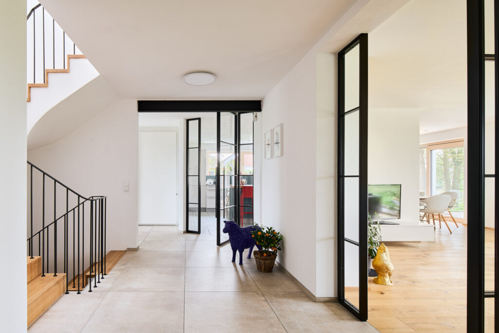 Vom großzügigen Eingangsbereich mit Treppenhaus gelangt man durch eine Stahl-Glas-Lofttüre in den offenen Wohnbereich mit angrenzender Wohn-Ess-Küche – hell, modern und einladend.