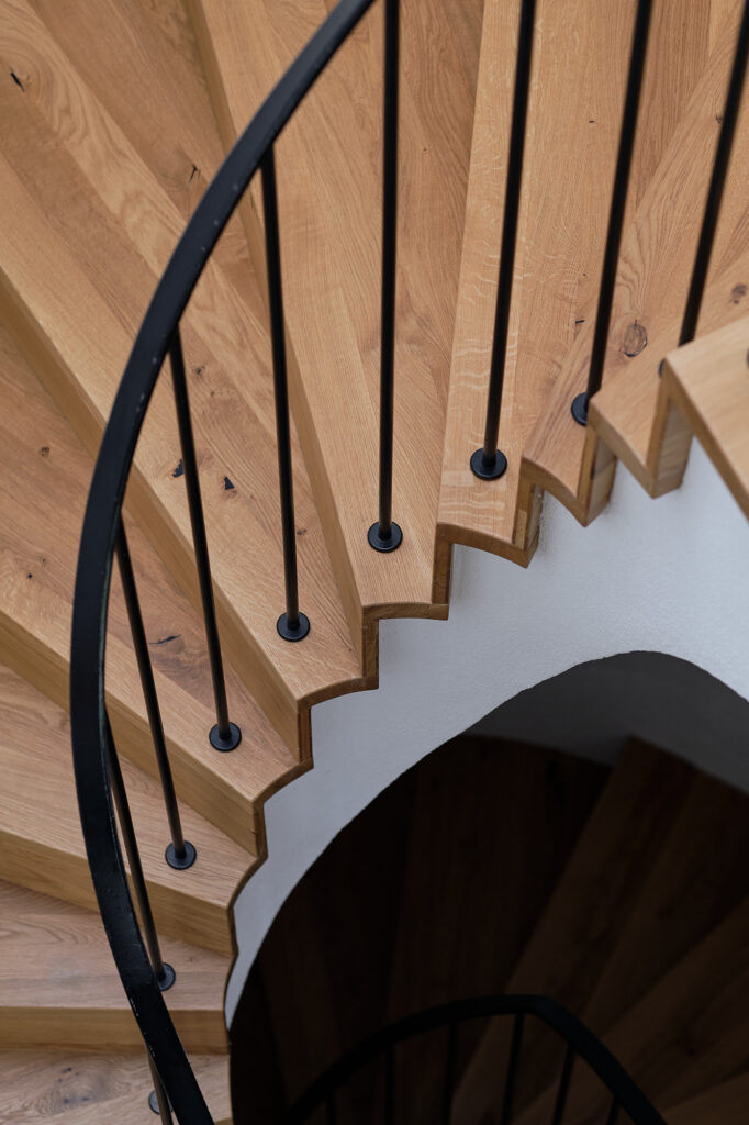 Der gute Geschmack unserer Baufamilie zeigt sich auch in der Materialwahl: Hier trifft schwarzer, pulverbeschichteter Stahl auf edle Tritt- und Setzstufen aus Eiche.